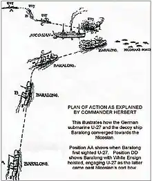 19 августа 1915 года британское судно-ловушка «Баралонг» (англ. HMS Baralong), шедшее под американским флагом, атаковало немецкую подводную лодку U-27, которой командовал Бернард Вегенер (в 1914 году потопивший легкий крейсер «Гермес»). Застигнутая вражеским огнём врасплох, лодка достаточно быстро затонула с большей частью экипажа. Но 11 подводников, в том числе командир лодки, бросились в воду и добрались вплавь до парохода «Никозиан» (Nicosian), который был остановлен подводной лодкой накануне появления судна-ловушки. Пять человек, включая Вегенера, поднялись на борт парохода и спрятались в его трюме. Шестеро остальных уцепились руками за фал, свисавший с борта судна в воду. Заметив происходящее, «Баралонг» направился к «Никозиэну». В это время старший лейтенант Годфри Херберт, командир «Баралонга», наблюдавший за этой сценой, посчитал, что немцы собираются захватить «Никозиэн», и отдал приказ открыть огонь по находящимся в воде людям. Сначала англичане расстреляли тех шестерых моряков, что держались на воде возле «Никозиэна». Затем они обыскали трюм и расстреляли спрятавшихся там германских матросов.