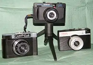 рамочный | 1/15, 1/30, 1/60, 1/125, 1/250, «В» | курковый взвод затвора и перемотки плёнки | обратная перемотка не предусмотрена конструкцией кассеты «Рапид» | синхроконтакт «Х» | нет | ![]() |