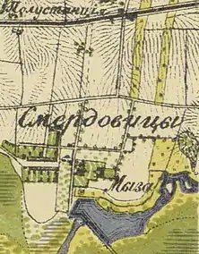 На карте Ингерманландии А. И. Бергенгейма, составленной по шведским материалам 1676 года, упоминается как деревня Smerdowits[4].