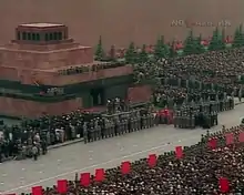 После этого руководители СССР вновь поднялись на трибуну Мавзолея, чтобы принять парад войск московского гарнизона, отдававших последнюю честь Брежневу, занимавшему при жизни также пост председателя Совета обороны СССР. В конце прощания с Брежневым члены иностранных делегаций, проходя мимо свежей могилы Брежнева, кланялись либо отдавали воинское приветствие[7].