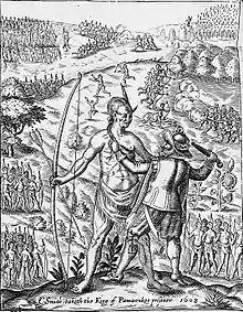 В начале 1607 года Джон Смит ушёл на разведку и был захвачен индейцами. В написанной им позже книге «История Вирджинии» он рассказывает, что его привели в лагерь вождя Союза алгонкинов Поухатана. Смита должны были казнить ударом дубины по голове, но его спасла юная дочь вождя, 12-летняя Покахонтас, обхватившая его руками. Вождь даровал Смиту жизнь, англичанин прошел индейский ритуал, после чего был объявлен приёмным сыном Поухатана и «главой племени пришельцев». Эти события легли в основу известного диснеевского мультфильма и нескольких полнометражных фильмов, в частности, драмы Теренса Малика «Новый Свет» (2005).