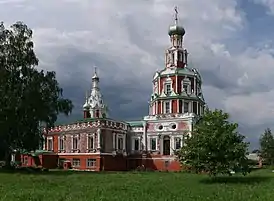 Храм выполнен в стиле московского барокко с характерной для него центрической композицией. Кирпичное здание выстроено кораблём и поставлено на высокий подклет. Ранее храм окружала галерея-гульбище, а с западной стороны был проход в жилые палаты. И гульбище, и палаты были разобраны, а вместо них в 1862—1866 годы пристроена трапезная с шатровой колокольней.