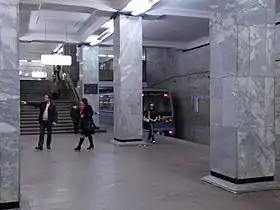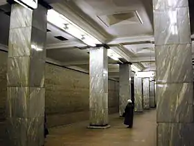 Колонны отделаны серым мрамором, пол отделан розовым гранитом. Путевые стены облицованы бежевой шестиугольной метлахской плиткой вверху и серой четырёхугольной внизу. Архитекторы: С. Г. Андриевский, Т. Н. Макарычев, Н. Д. Колли[5].