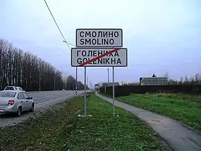 ![]() Въезд в деревню Смолино по М-10 со стороны Москвы | |