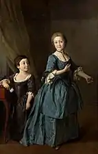 - Портрет Ф. С. Ржевской и Н. М. Давыдовой[8] (1772). Ржевская (справа) изображена в голубом форменном платье, установленном для воспитанниц второго возраста Воспитательного общества благородных девиц; Давыдова (слева) представлена в форменном платье кофейного цвета, установленном для первого (младшего) возраста. Эта маленькая смуглая грузинская княжна держит в руке белую розу — символ юности и добродетели. Девочки демонстрируют свои светские манеры, утверждая тем самым успехи института в воспитании юношества. Первый в серии портрет, вероятно, явился пробным.