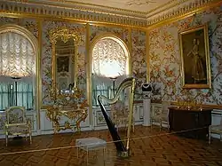 - Портрет Г. И. Алымовой (1776). Одна из лучших арфисток своего времени изображена с любимым инструментом, который одновременно делает её и Аллегорией Музыки. Она также одета в форменное парадное платье из белого шёлка, установленное для воспитанниц IV (старшего) возраста, которое выглядит особенно роскошно: это платье «полонез» с «хвостом» и «крыльями» на большом панье (каркасе из китового уса). Подол юбки украшен фалбалой, а лиф — пышными бантами. Нити крупного жемчуга обвивают длинные локоны, драгоценные камни вплетены в причёску. Эту роскошь связывают с тем, что к этому времени юная Глафира уже стала предметом всепожирающей страсти Бецкого[14].
