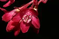 Цветки трубчатые диаметром 5—10 мм, от насыщенного красного до розового цветов, образуют поникающие соцветия в виде кистей, состоящих из нескольких (обычно двух) десятков цветков. Цветение происходит в мае.