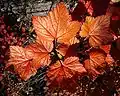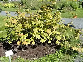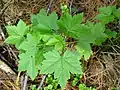 Листья плотные, округлого очертания, 3—5-лопастные, в основании усечённые, обычно голые с обеих сторон. Длина листа до 6 см, ширина — до 8 см. Лопасти туповатые.