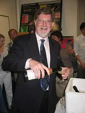 ![]() Джордж Смут празднует вручение Нобелевской премии 3-го октября 2006 г. | |