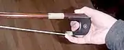 Смычок состоит из деревянной трости (древка), пучка волос с лошадиного хвоста и колодочки с винтом. Одним концом волос закреплён в головке трости, другим соединён с подвижной колодочкой. При помощи винта колодочка передвигается и натягивает или ослабляет волос.