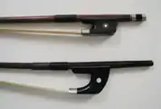 Для контрабаса используется два вида смычков: французский и немецкий[4]. Французский в общем такой же как и смычки других инструментов семейства скрипичных. Немецкий отличается более высокой колодкой, определяющей способ держания смычка.