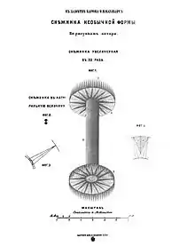 Снежинка необычной формыОни состояли по большей части из небольших столбиков, в два миллиметра длины, фиг. 2, на обоих концах которых и в плоскости, перпендикулярной к их оси, прикреплены были диски, диаметром около 1 миллиметра. Такой оригинальной формы снежинок мне ранее не доводилось видеть, а потому, вооружившись лупою, я стал ближе рассматривать все подробности их строения, которое и старался выразить на фиг. 1. Столбик а из белого непрозрачного льда казался мне цилиндрическим без внутренней пустоты. Все столбики были одинаковых размеров, около 2 миллиметров длины и около 1⁄4 миллиметра ширины. Быть может и даже вероятно, что столбики эти были шестигранные призмы; но на рисунке я не решился этого сделать, так как, при внимательном наблюдении в лупу нескольких десятков снежинок, столбики казались мне цилиндрическими.