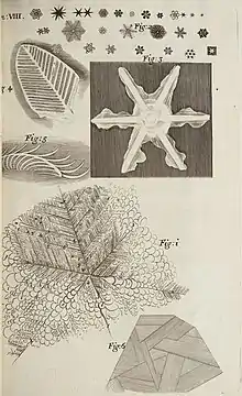 Считается, что первое описание снежинок как кристаллических объектов было дано немецким математиком и астрономом Иоганном Кеплером в 1611 году в трактате «О шестиугольных снежинках»[11]. Однако, в то же самое время, имеются сведения, что в этом аспекте Кеплер был продолжателем наблюдений датского астронома Тихо Браге, чьи зарисовки выпадавших снежинок дошли до современности[12]. В 1635 году геометрические свойства снежинок вызвали интерес у французского естествоиспытателя и математика Рене Декарта. Декарт впервые обнаружил редкую форму снежинки с двенадцатью лепестками, происхождение которой непонятно по настоящее время. В 1665 году английский изобретатель Роберт Гук провёл серию наблюдений за снежинками с помощью микроскопа и опубликовал свои результаты в виде рисунков[11].