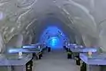 - Ресторан имеет ледяные столы и сиденья, покрытые оленьим мехом, а также ледяные скульптуры.