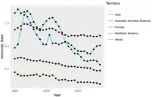 Снижение преступности наблюдается в регионах Европы, Северной Америки, Австралии и Новой Зеландии, а также в Азии. В Европе снижение наиболее очевидно — здесь уровень снизился почти на две трети: с 8,8 случаев на 100 000 в год в 1994 году до ниже 3-х в 2017 году.[9]