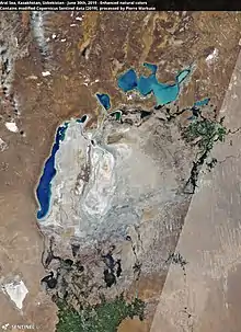 По состоянию на 2019 год Аральское море было разделено на пять периодически сообщающихся водоёмов: Большой Арал, распавшийся в 2001 году на восточную и западную части, Малое море, залив Тще-Бас и Центральный Арал[46]. Западный бассейн Большого моря питают подземные воды, благодаря которым замедляется высыхание[47][48], однако в целом водный баланс остаётся отрицательным[9] и продолжает расти солёность[49]. С восточной частью его соединяет пролив Узун-Арал.