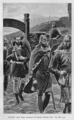 ![]() Аасгрим и Снорри Годи (иллюстрация Андреаса Блоха к "Саге о Ньяле", 1898) | |