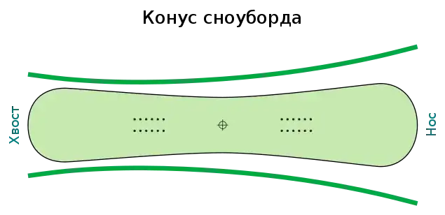Конус — разница между ширинами носа и хвоста, когда хвост уже чем нос доски. Встречается так же обратный конус.