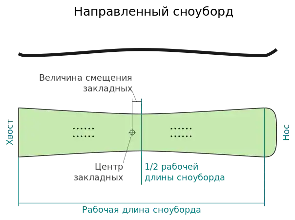 - Рабочая длина — это общая длина минус длина загнутого носа и пятки. Доски, у которых отношение рабочей длины к полной меньше, легче управляются на неухоженных трассах (по рыхлому снегу), но хуже при карвинговых поворотах (так как уменьшается длина соприкосновения края доски и склона)
