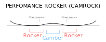 - Сноуборд может иметь нос загнутый немного выше, чем хвост, для того, чтобы проще «всплывать» в рыхлом снегу.