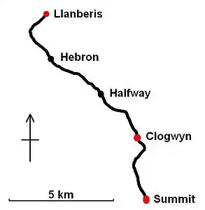 Сноудонская горная железная дорога начинается на вокзале, который расположен в Лланберисе недалеко от вокзала Приозёрной железной дороги Лланбериса и насчитывает две платформы. Сразу за вокзалом путь берёт крутой подъём с уклоном 1:5,5, бежит некоторое время среди деревенских кварталов и садов, а затем, повернув к юго-востоку, подходит к первой станции — «Водопадной» (Waterfall station). Станция была построена, чтобы дать удобный для туристов подход к водопаду, что находится близ железной дороги, но ныне она — закрыта, хотя платформа и станционное здание содержатся в порядке. За «Водопадной» линия пробегает по мосту через реку, которая отмечает начало собственно горного её участка, где уклоны в среднем составляют 1:7,86[1]. Далее путь поднимается к разъезду «Хеврон» (Hebron), названному так по расположенной поблизости Хевронской часовне. При строительстве предполагалось, что от этого места до Лланбериса будут курсировать товарные поезда, гружёные местной сельскохозяйственной продукцией. От «Хеврона» линия идёт к разъезду «Промежуточному» (Halfway), отмечающему примерную половину пути к вершине и расположенному на высоте 500 м над уровнем моря. Всё это время путь имеет к востоку от себя горный склон, поднимающийся вверх, а к западу таковой же, но спускающийся вниз. Близ разъезда, если пойти по пешеходной тропе вдоль железнодорожного полотна, расположено кафе «Halfway».