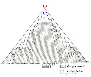 Первоначально это сооружение представляло из себя ступенчатую пирамиду, состоящую из семи или восьми ступеней. Ныне солнце освещает лишь остатки её третьей и четвертой ступеней. Первые две скрыты в окружающих развалинах, от пятой остался лишь небольшой выступ, от двух или трех последних сохранились упавшие блоки; раскопки в её непосредственной близости позволили обнаружить множество отполированных известняковых облицовочных плит. Вход в пирамиду нашли в 1882 году рабочие Масперо; относительно того, кого считать первым исследователем, вступившим в её погребальную камеру, в литературе существуют забавные разногласия: согласно «Египетским пирамидам» англичанина Эдвардса, это был француз Масперо, «Справочнику египетской археологии» француза Вандье — англичанин Питри. В камере были найдены лишь обломки деревянного гроба, который по своему стилю явно относился к эпохе Древнего царства. Однако, против ожидания, саркофага там не оказалось, хотя камера по размерам (5,9 × 2,65 метра) явно была рассчитана под него. То, что саркофаг некогда там находился, в первую очередь подтверждает толстая балка со следами каната, с помощью которого опускали саркофаг в камеру. А почему его там нет, объяснить довольно просто. Вынести саркофаг из этой пирамиды было гораздо легче, чем из любой другой.