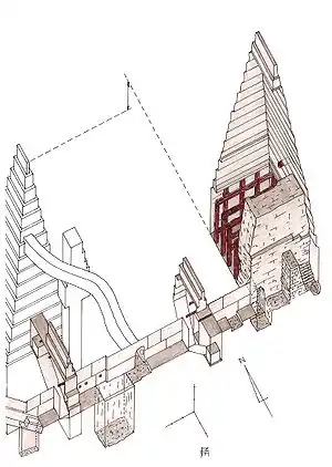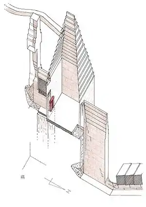 Территория пирамиды была окружена стеной. Заупокойный храм, соединенный платформой с оградой пирамиды, также был обнесен стеной. Его размеры приблизительно 47,16 на 26,20 м; храм ориентирован по оси север—юг. Платформа примыкала к юго-западному углу пирамиды, проходя через стену ограждения. Затем, пройдя через узкий двор, можно было с южной стороны попасть в длинный зал, украшенный рельефами. С двух сторон от зала располагались большие помещения, служившие кладовыми; в одном из них, возможно, находилась сокровищница храма. На продолжении оси была сделана вторая дверь, ведущая в открытый двор. В его северной части располагался портик с десятью столбами, скрывавшими шесть часовен в форме монолитных наосов, где стояли статуи царя. Культ фараона сохранялся в этом храме в течение долгого времени, о чем свидетельствуют находки археологов. Храм был разрушен не ранее XVIII династии.[9][10]