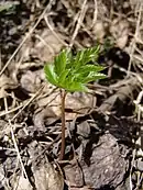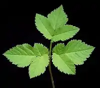 Нижние листья дважды тройчатые, листочки заострённые, продолговато-яйцевидные до 8 см длиной, по краю остропильчатые; верхние листья тройчатые на коротких черешках, мелкие. Листья сверху почти голые, снизу опушённые. Жилкование перистое.