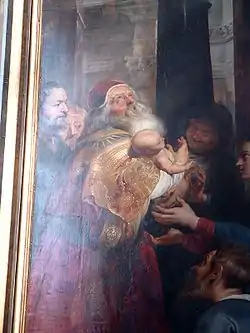Последовательно в триптихе описываются сцены: «Встреча Марии и Елизаветы», «Снятие с креста» и «Представление Иисуса в Иерусалимском храме». В середине центрального полотна между восемью фигурами находится Христос в необычайно трогательной позе. Тело Христа осторожно и торжественно снимают с креста. Над крестом находятся два человека, один из них ещё поддерживает тело Христа, в то время как Св. Иоанн, стоя внизу, принимает Христа и несет основную его тяжесть. Коленопреклоненные святые жены готовы помочь св. Иоанну, а Богоматерь (изображенная слева) с белым, как мел, лицом приближается к Христу, протягивая ладонь, чтобы принять тело сына. Она смотрит на него с горестью, проникающей в сердце всякого, кто внимательно вглядится в её лицо. Иосиф Аримафейский, стоя на лестнице, поддерживает тело под руку. С противоположной стороны другой старец спускается по приставной лестнице, выпустив угол савана и передав свою ношу стоящему рядом св. Иоанну. Наиболее поразительна во всей работе фигура мертвого Христа. Знаменитый английский живописец XVIII века сэр Джошуа Рейнолдс (1723—1792) писал: