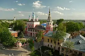 На галерею с северной и южной сторон ведут две широкие лестницы на ползучих арках (в настоящее время заложенных). Ограждающий галерею и лестницы, глухой парапет со стороны двора обработан ширинками. Со стороны улицы в кладку парапета вставлены фигурные балясины из белого камня. С галереи на колокольню ведёт внутристенная лестница. Колокольня — с шатровым верхом, представляет собой восьмигранное помещение с колоколами, поставленное на трехъярусный четверик. По всем граням шатра колокольни в четыре ряда расположены двойные, четырехугольные и круглые пролеты слуховых окон. Нижний ярус колокольни укреплен контрфорсом; по бокам его вырезано по кресту, заключенному в четырехугольник, по углам которого по круглому диску, так что кресты окружены четырьмя дисками[5].