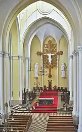 Пресвитерий собора отделён деревянными резными перегородками от часовни Божьего Милосердия с алтарём Святых Даров и от преддверия сакристии. В центре на стене апсиды — распятие, высота которого составляет девять метров, а фигуры Христа на кресте — три метра. По обе стороны от распятия установлены две гипсовые фигуры — Божьей Матери и Евангелиста Иоанна. Они выполнены подмосковным скульптором С. Ф. Захлебиным[22].