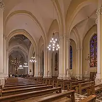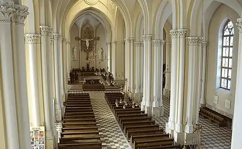 В центральном нефе расположены два сектора скамеек, разделённых проходом. Боковые нефы имеют по пять колонн-контрфорсов, в начале каждого из них установлены исповедальни — конфессионалы. В левой части собора находится часовня Божьего Милосердия, в которой размещены дарохранительница и алтарь Святых Даров. Главный объём храма опирается на десять основных контрфорсов, символизирующих десять заповедей. До 1938 года в боковых нефах собора также стояли скамьи: левая сторона предназначалась для женщин, а правая — для мужчин[17][16].