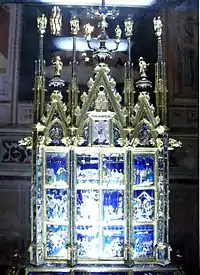 Архитектонический реликварий из позолоченного серебра с раскрывающимися створками и эмалевыми вставками (1,39 х 0,63 м) представляет собой шедевр ювелирного искусства работы мастера Уголино ди Виери. Он создан в 1337—1339 годах. Его композиция в закрытом виде условно воспроизводит в миниатюре фасад собора в готическом стиле. Реликварий увенчан миниатюрными скульптурами святых и Распятием с инкрустациями драгоценными камнями. На створках и пределле в технике росписи по эмали с изображены сцены из жизни Христа и больсенского чуда. В праздник Тела Христова реликварий раскрывают и можно видеть Святой покров с тёмными следами крови.