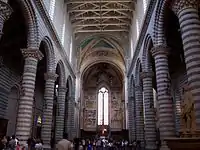 Трёхнефный интерьер повторяет узор наружных стен в тёмно-серую и белую полоску. До высоты полутора метров он выполнен из каменной плитки. Пространство выше, предназначенное для фресок, в XIX веке было закрыто побелкой. Нефы разделяют круглые в сечении колонны с типично романскими лиственными капителями, поддерживающими полуциркульные арки. Боковые нефы перекрыты веерными сводами. В 1886—1891 годах Франческо Моретти заполнил боковые окна в верхней части витражами в неоготическом стиле, а у основания — по итальянской традиции, слегка просвечивающими алебастровыми плитами, благодаря чему в помещении поддерживается прохлада жарким летом. В центральном окне апсиды сохранился витраж 1334 года работы Джованни ди Бонино.