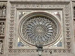 Над окном-розой в нишах помещены статуи двенадцати апостолов, а по сторонам — попарно статуи двенадцати Ветхозаветных пророков. Статуи в нишах типичны для готической архитектуры. Восемь из них приписывают Николе де Нуто. В антрвольтах вокруг розы мозаики изображают четырёх Учителей Церкви (святых Августина, Григория Великого, Иеронима и Амвросия). В обрамление розы вписаны 52 скульптурные головы, а в центре — голова Христа.