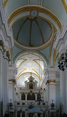 Перекрытие нефов храма, интерьер которого сохранил свою объёмно-пространственную композицию с XVII века, составляют цилиндрические своды с распалубками. Над бабинцем храма расположены хоры[5]. При перестройке в 1735 году для фасада церкви и её интерьера было выполнено единое ордерное оформление. Так, для стен и столбов храма характерна раскреповка пилястрами и широкими карнизными поясами, декор которых представляет собой богатый растительный орнамент с мотивами стилизованных листов аканта в дополнение к горельефным изображениям головок ангелов. Для декора сводов, в частности плафонов и обрамлений рёбер распалубок, характерен лепной геометрический орнамент. Галерея, идущая над антаблементами храма по всему его периметру, обнесена кованной металлической решёткой с орнаментом[4][21][6]. Лепка, использованная в оформлении интерьера, сделана в технике стукко[21][11][2]. В интерьере средокрестие оформлено плоским и ложным куполом[58].