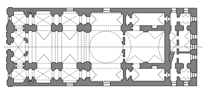 - Благодаря размещению трансепта точно посредине внешней композиции и торцовые, и боковые фасады храма обрели зеркальную симметрию. В интерьере же данный попарно равноконечный крест, возникший в результате в верхнем сечении церкви, отмечен куполом на средокрестии. См.: Габрусь Т. В. Мураваныя харалы: сакральная архітэктура беларускага барока. — Мн.: Ураджай, 2001. — С. 143. — 286 с. — ISBN 985-04-0499-X..
