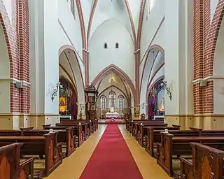Сначала церковь была зального типа, в настоящее время она представляет собой трёхнефовую базилику, которая в плане достигает 27 на 50 метров. Башня расположена над центральной западной травеей (ячейкой бокового нефа), там, где находится прямоугольный алтарный придел. С северной стороны церкви расположена сакристия (ризница). Главный церковный зал (имеется в виду центральный неф храма) разделён крестообразными сводами плафона (и соответствующими им колоннами также крестообразной формы) на шесть одинаковых травей. В остальном же интерьер церкви довольно прост и скромен, что в целом соответствует концепции оформления убранства католических культовых зданий.