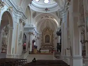 Боковые нефы покрыты куполами (в правом нефе есть три монофоры); центральный неф с мощными пилястрами с квадратным мраморным цоколем, поддерживающими свод с люнетами, украшенными картинами со сценами из жизни Пресвятой Девы Марии и Святого Иустина из Кьети. В трансепте два богато украшенных алтаря и две часовни. Над трансептом большой круглый купол с восемью слуховыми окнами.