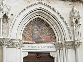 Фасад украшен готическим люнетом над порталом. Далее по правой стороне, арочный портал, обрамленный колоннами, которые поддерживают часовеньки-ниши со статуями святых Памфилия и Пелина, созданными в 1391 году Никола Сальвитти. Леонардо из Терамо в XVI веке украсил люнет над этим порталом фреской.