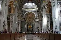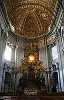 В подкупольном пространстве над главным алтарём находится шедевр Бернини — огромный, высотой 29 метров киворий, опирающийся на четыре витые колонны, на вершинах которых установлены скульптуры ангелов. Человек среднего роста не достигает даже высоты постаментов бронзовых колонн. Среди ветвей лавра на верхних частях колонн видны геральдические пчёлы семейства Барберини, к которому принадлежал Папа Урбана VIII, по чьему распоряжению создавали это необычное произведение. Бронзу для кивория взяли из Пантеона, разобрав по приказу папы (Барберини) кровлю пронаоса. Оформление алтаря и спуска в крипту к гробнице апостола создал К. Мадерна.