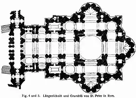 После смерти Браманте строительство в 1514—1520 годах возглавлял Рафаэль Санти, вернувшийся к традиционной форме плана базилики в виде латинского креста, затем Бальдассаре Перуцци, остановившийся на центрическом сооружении, и Антонио да Сангалло, избравший базиликальную форму. Наконец в 1546 году руководство работами было поручено Микеланджело Буонарроти. Он вернулся к идее центрического крестово-купольного сооружения, но его проект предусматривал создание многоколонного входного портика с восточной стороны (в древнейших базиликах Рима, как и в античных храмах, вход находился с восточной, а не с западной стороны).