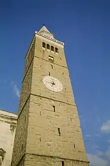 Колокольня соединена с собором, который изначально был независимой городской башней в романском стиле (XII век) и завершена восьмиугольной пирамидальной крышкой аквилейского типа (1644). Высота колокольни составляет 53 метра. В нем, среди прочего, находится самый старый колокол Святого Назария 1333 года, отлит Николасом и Мартином, сыновьями мастера Якова Венецианского.