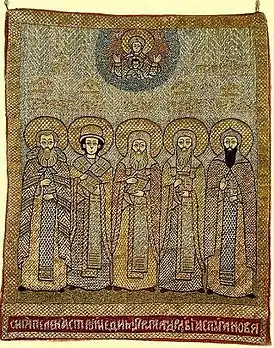 ![]() Новгородские святители (пелена, середина XVII века) | |