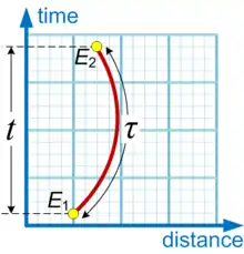 В теории относительности собственное время вдоль времениподобной мировой линии определяется как время, измеренное часами, перемещающимися по этой линии. Таким образом, оно не зависит от координат и является скаляром Лоренца.[1] Собственный временной интервал между двумя событиями на мировой линии — это изменение собственного времени. Этот интервал представляет интерес, поскольку собственное время фиксируется только с точностью до произвольной аддитивной константы, а именно установки часов на какое-то событие вдоль мировой линии. Собственный интервал времени между двумя событиями зависит не только от самих событий, но и от мировой линии, соединяющей их, и, следовательно, от движения часов между событиями. Он выражается в виде интеграла по мировой линии. Ускоряющиеся часы будут измерять меньшее время, прошедшее между двумя событиями, чем время, измеренное неускоряющимися (инерциальными) часами между теми же двумя событиями. Примером этого эффекта является парадокс близнецов.[2]