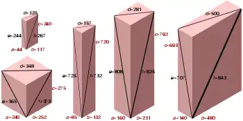 - Одно ребро делится на 4, второе делится на 16, третье нечётное (если, конечно, он примитивный — то есть, НОД(a, b, c) = 1).