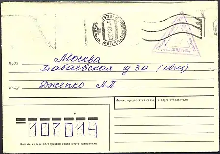 Порядок составления адреса на конверте для письма военнослужащему, проходящему службу на территории СССР, был следующий — почтовый индекс, указание союзной республики, область, район, почтовое отделение (п/о, при наличии), населённый пункт, номер войсковой части войск или сил, после букв в/ч (например — войсковая часть 54321) и если надо литер (буква) подразделения. Отличием в написании письма военнослужащим, рабочим и служащим Советской Армии, проходившим службу за пределами СССР, являлось то, что в графе «почтовый индекс» на конверте или открытке — записывался номер войсковой части. Поскольку номера войсковых частей в Советской Армии были пятизначными, а в пунктах почтового индекса следовало заполнить шесть полей — перед номером войсковой части ставилась цифра 0 (ноль). Дополнительной информацией в графе «Куда» — вписывался номер войсковой части после букв п/п (полевая почта). Пример — требовалось написать письмо военнослужащему 2-й разведывательной роты 781-го отдельного разведывательного батальона (в/ч 71240) дислоцированного в Афганистане в городе Баграм. В таком случае в графу индекс записывалось — «071240». В графе «Куда» — Войсковая часть полевая почта 71240 «Б» (Б — индекс подразделения). Запрещалось указывать на конверте/открытке государство и город, в котором проходил службу военнослужащий. Этим пользовались многие из солдат, попавшие служить в Афганистан, которые писали родным, что их отправили служить в Монголию.