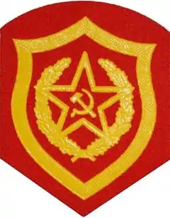 Нарукавные знаки[7] или, как их в обиходе позже стали называть военнослужащие, «шевроны» по видам ВС и родам войск (сил, службам) видов и спецвойскам (спецслужбам) носили: сержанты и солдаты срочной службы, курсанты военно-учебных заведений — на шинелях и на парадно-выходной форме одежды; прапорщики, сержанты и солдаты сверхсрочной службы — на парадно-выходной форме одежды (кроме шинелей). На полевой, рабочей (подменной) форме одежды (пример, на технических комбинезонах (комбез) танкистов и ракетчиков, прыжковых костюмах (песчанка) военнослужащих подразделений специального назначения, на десантных комбинезонах и так далее) ношение нарукавных знаков не было предусмотрено.