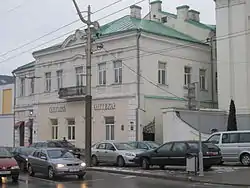 Трехэтажное здание. Выделяется красным цветом кирпича, из которой построен. Известный как дом купца Муравьева. Возведенный в 1898, по другим сведениям около 1914 и даже 1890 году. Памятник архитектуры стиля модерн. После освобождения города от немецко-фашистских захватчиков в 1944 в здании размещалась областная библиотека имени Карского. С конца 80 гг 20 в. дом не эксплуатируется, сейчас на ремонте.