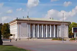 Длительное время существовала легенда, что здание построено «задом наперед»: фасад, который выходит к Дому быта, должен быть главным. Но со слов дочери прораба Р. Попова, который строил это здание, при осуществлении проекта была убрана колоннада перед главным фасадом, поэтому он и представляется не завершенным. В советское время перед главным входом в во время государственных праздников устанавливалась трибуна, возле которой проходили праздничные колонны. Сейчас на реконструкции. Со стороны дома быта в доме находится кафе «Сахара», которое работает пн-чт, вс 15.00-2.00, пят-суб 15.00-5.00.